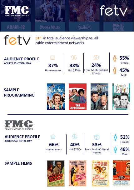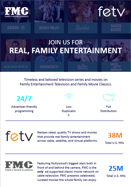 Looking to advertise on FETV or Family Movie Classics (FMC)? These family-friendly national TV networks deliver strong reach with adults 35+, seniors, and loyal classic-TV viewers. FETV and FMC are ideal for advertisers promoting home services, health products, financial services, senior care, and nationwide direct-response campaigns.