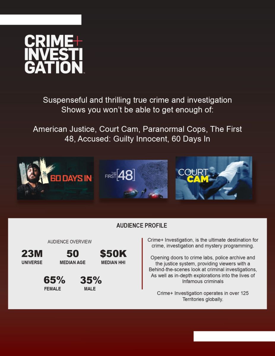 With a global footprint spanning more than 125 territories, Crime + Investigation reaches an estimated 23 million viewers, with a median age of 50 and a median household income of approximately $50,000. The audience is 65% female and 35% male, making the network an effective platform for brands seeking engaged, information-driven viewers in a brand-safe environment.