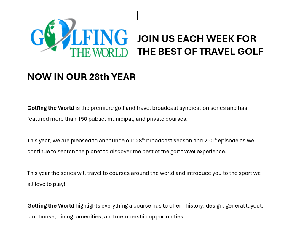 From hidden gems to iconic courses, Golfing the World takes you on the ultimate journey across the globe — one tee at a time. Join us as we explore the beauty, challenge, and culture of golf worldwide. New episodes, new destinations, same passion for the game.