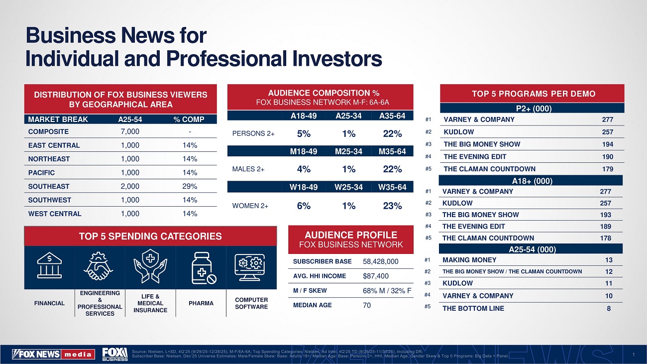 Fox Business programming reaches viewers who are actively interested in investing, entrepreneurship, financial planning, and economic trends. The audience skews toward decision-makers with higher household incomes, making the network an effective environment for brands in finance, professional services, healthcare, insurance, technology, education, and premium consumer products.