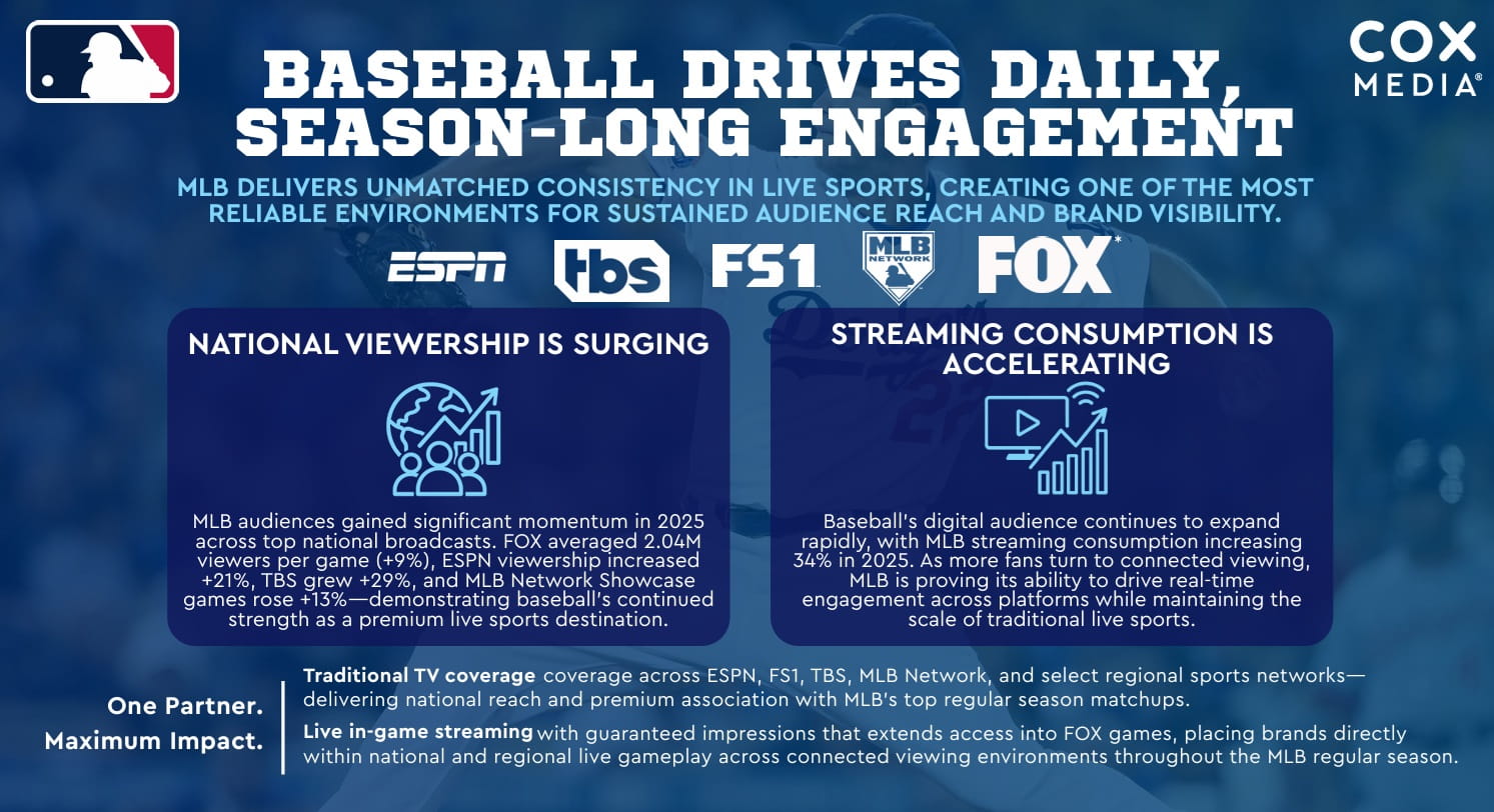 Major League Baseball continues to demonstrate the enduring power of live sports as a premium advertising environment. Recent industry data shows strong audience growth across national television broadcasts while streaming consumption continues to accelerate across connected TV platforms.