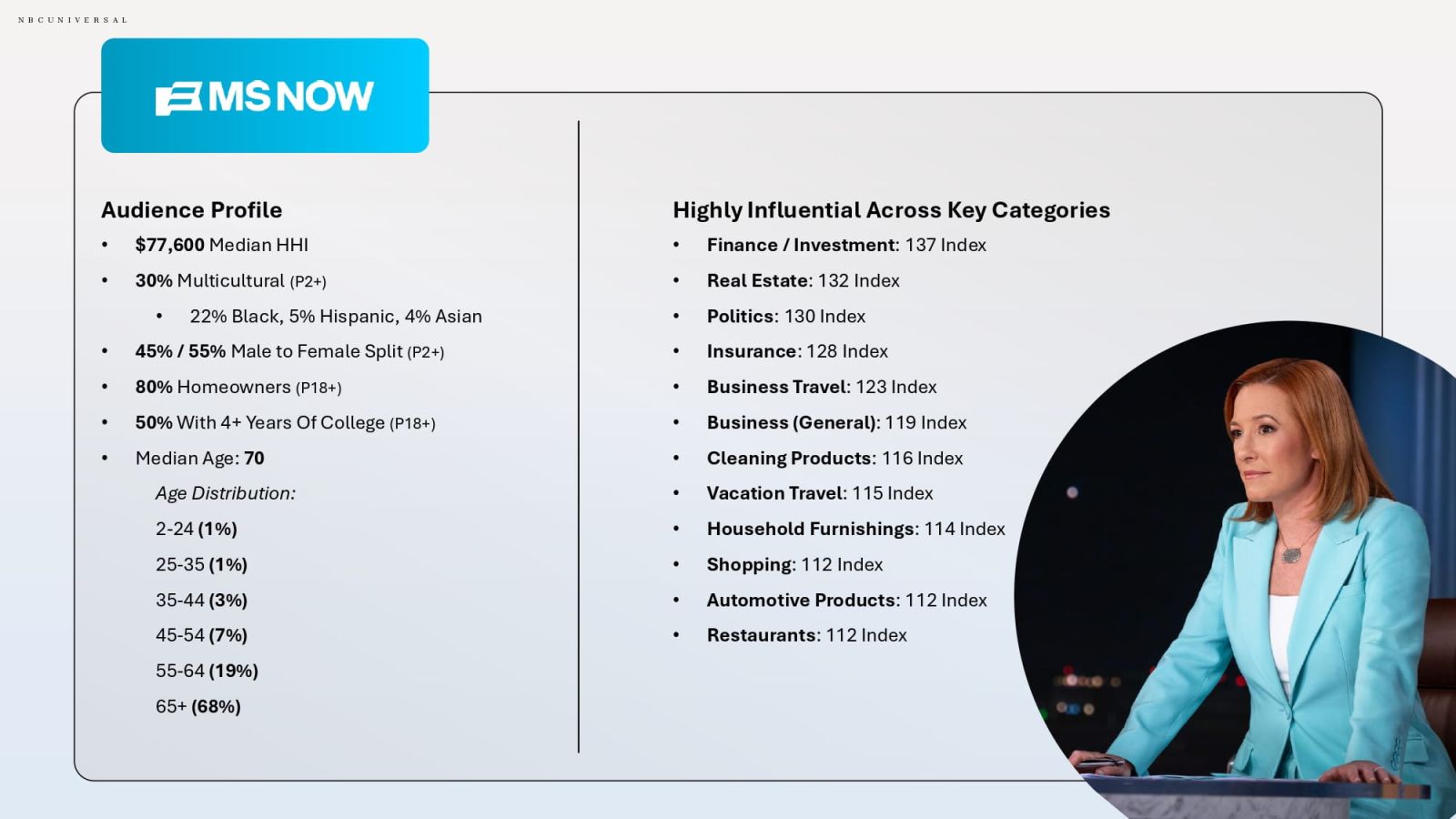 MS NOW, previously known as MSNBC, continues to be one of the most recognized national news brands in the United States. Its programming reaches a politically engaged, highly attentive audience across news, commentary, and current-events content.