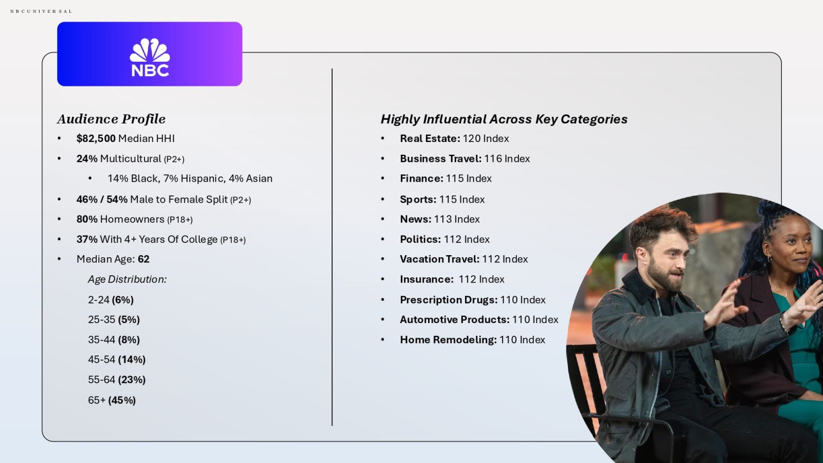 As audience fragmentation continues across digital platforms, broadcast networks like NBCUniversal remain central to effective, well-balanced media plans.
