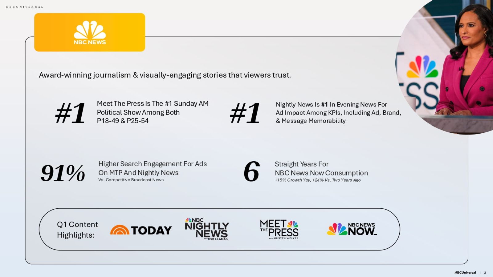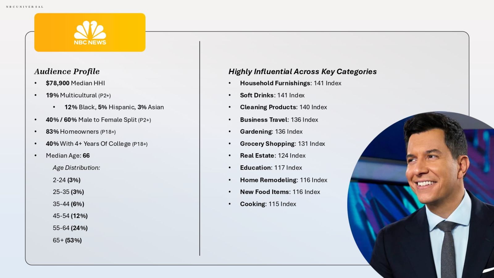 NBC News continues to deliver award-winning journalism and trusted reporting across platforms. Meet the Press ranks as the #1 Sunday morning political program among key adult demographics, while NBC Nightly News leads evening news for advertising impact, brand memorability, and message recall.