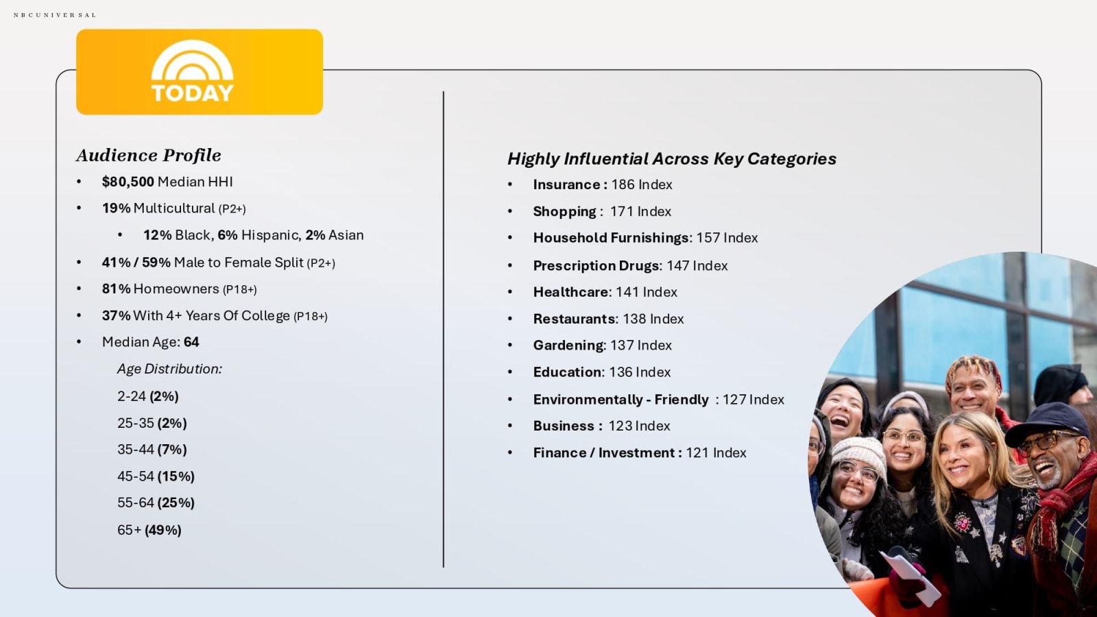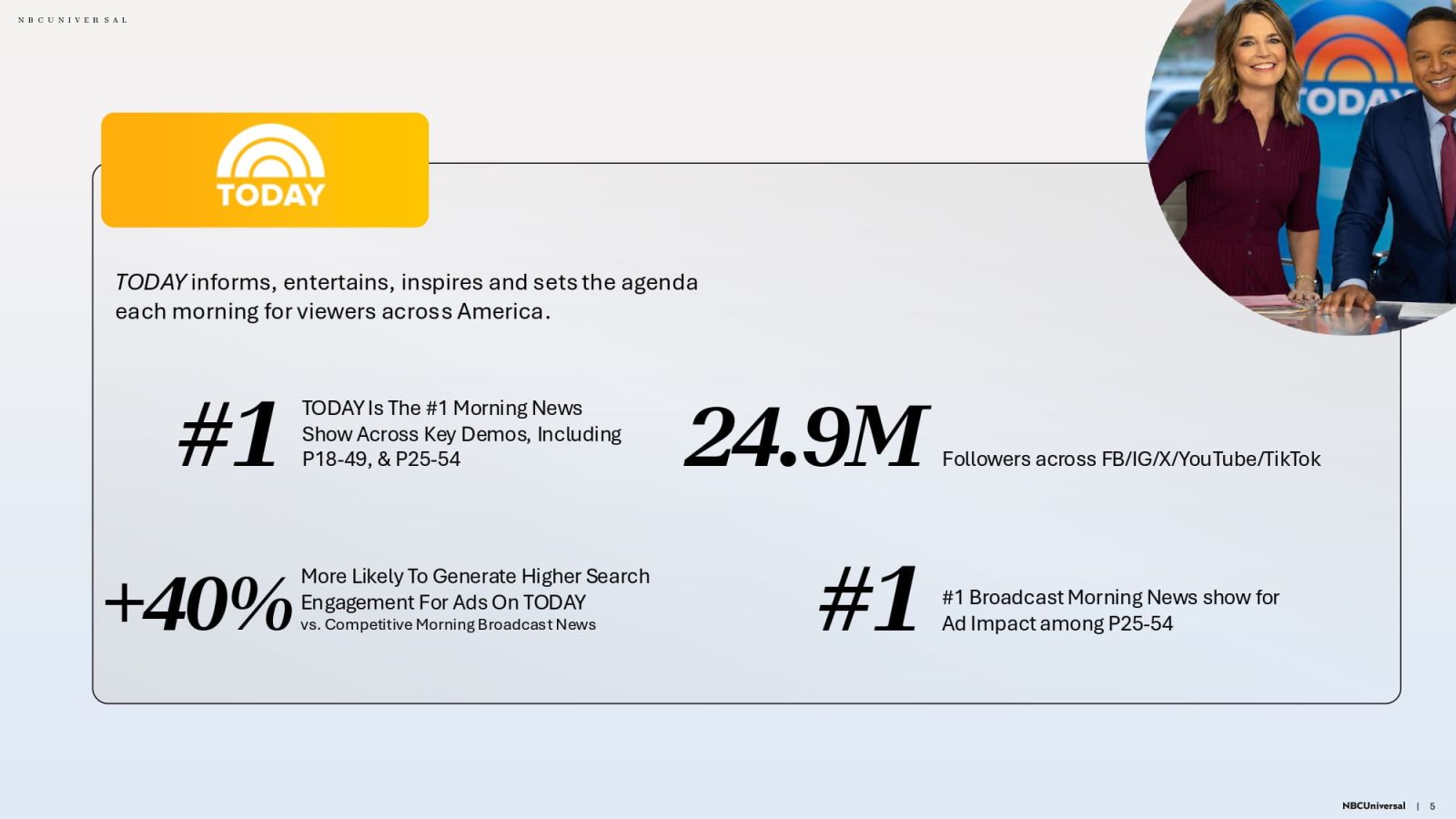 The Today show remains the #1 broadcast morning news program, delivering meaningful reach across adults 18–49 and 25–54. With more than 24.9 million followers across social platforms, TODAY continues to influence daily consumer behavior and brand consideration.
