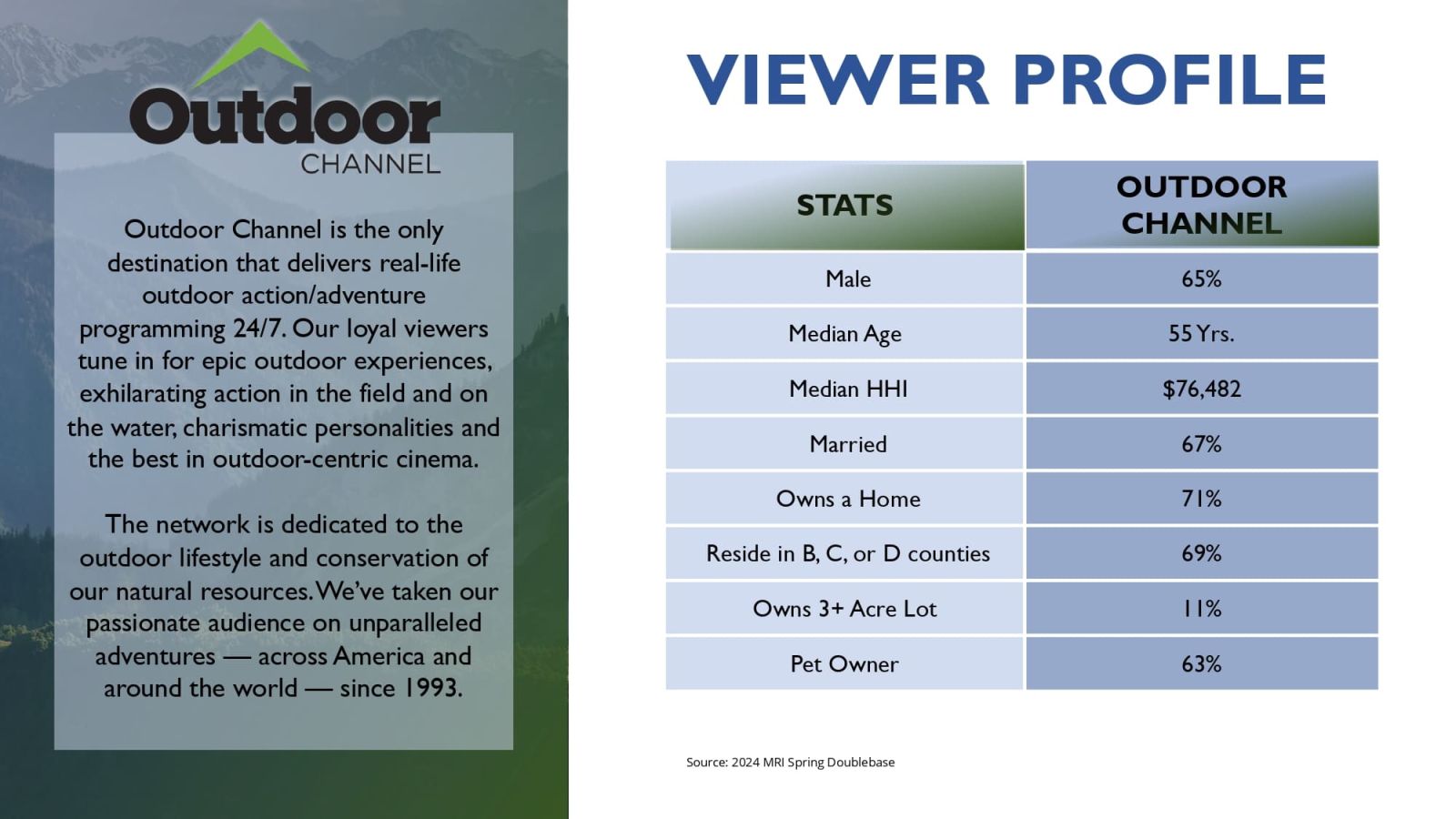 Advertising on Outdoor Channel allows brands to connect with viewers who actively seek products and services related to outdoor recreation, conservation, equipment, travel, and lifestyle. Because the audience is intentional and attentive, Outdoor Channel delivers strong performance for advertisers looking to build brand awareness and credibility through television.
