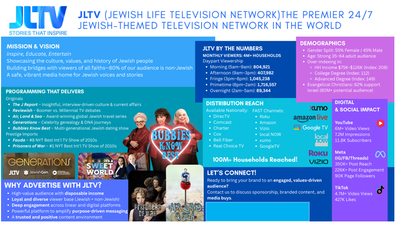 Jewish Life Television (JLTV) is in over 100 million homes and available on every major streaming platform, delivering engaging, inspirational, and culturally rich programming to viewers nationwide.