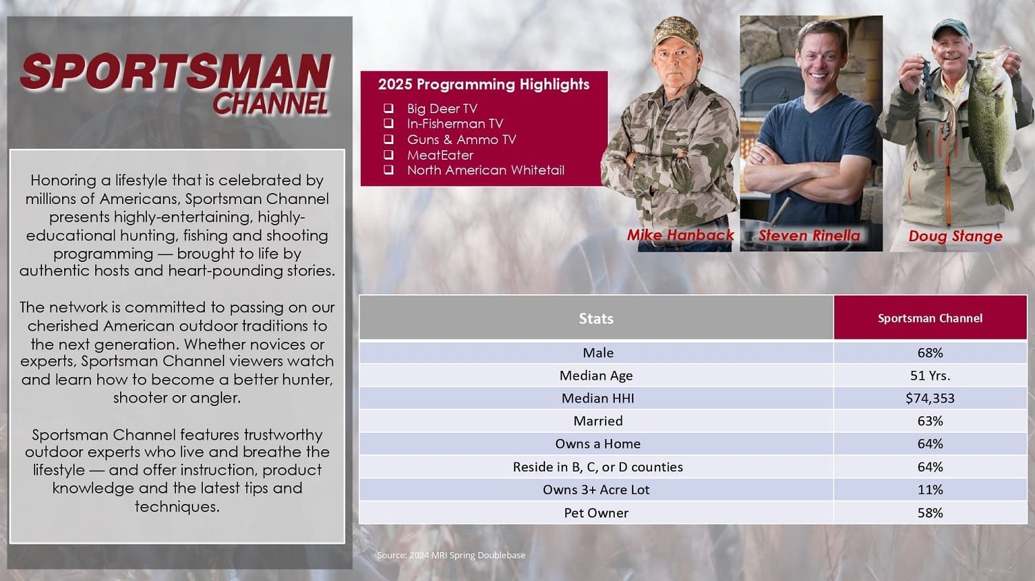 For brands looking to reach hunters, anglers, and outdoor enthusiasts through television advertising, Sportsman Channel offers a proven platform to build brand awareness, credibility, and long-term recognition.