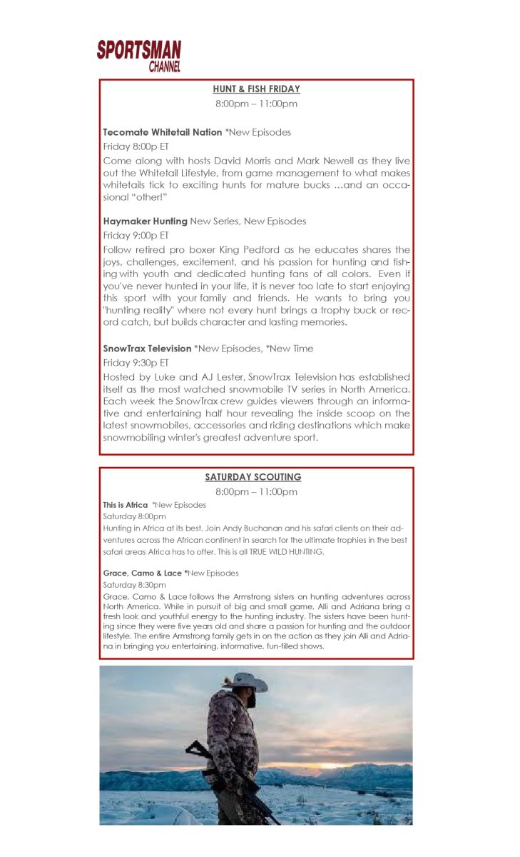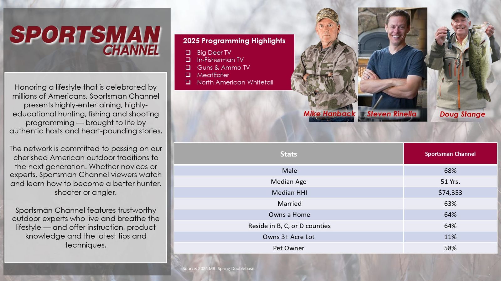 Sportsman Channel offers brands a powerful way to connect with consumers who actively participate in outdoor recreation and invest in equipment, travel, vehicles, land, firearms, and lifestyle products.