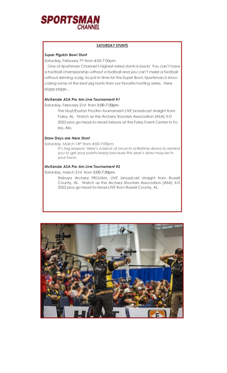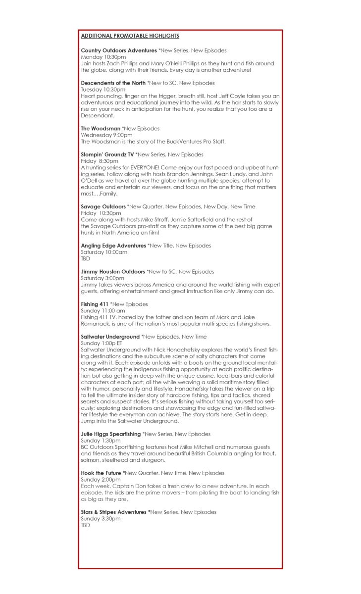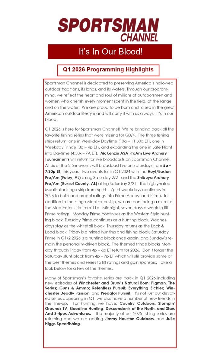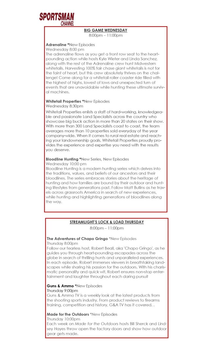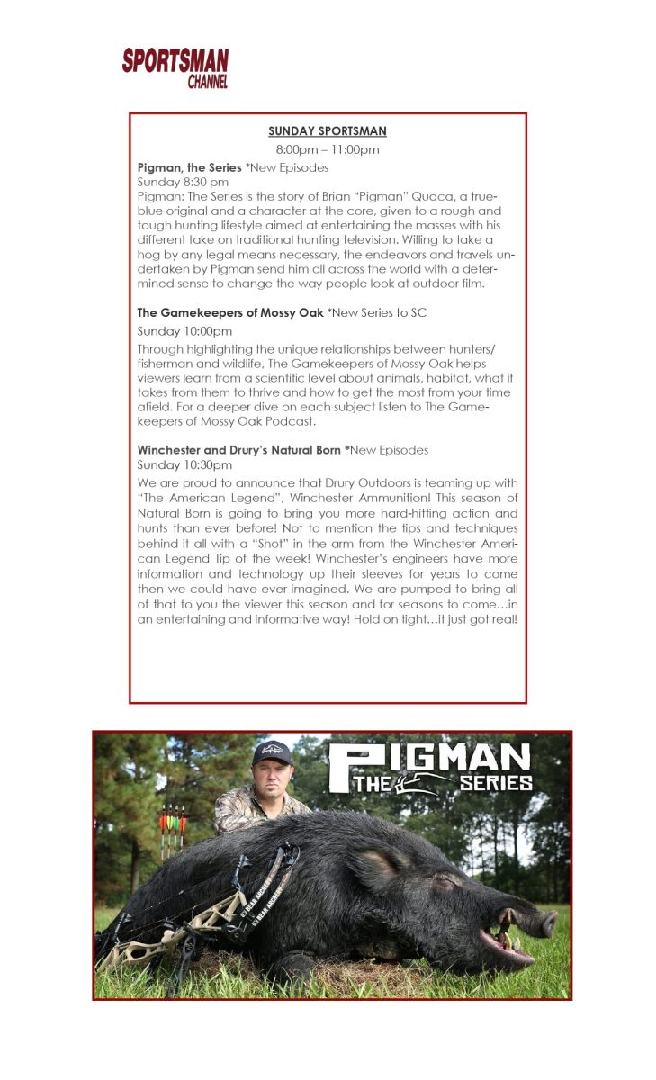 Notable programs include MeatEater, Guns & Ammo TV, In-Fisherman TV, North American Whitetail, Pigman: The Series, Winchester and Drury’s Natural Born, and Jimmy Houston Outdoors, along with dozens of original and returning series.
