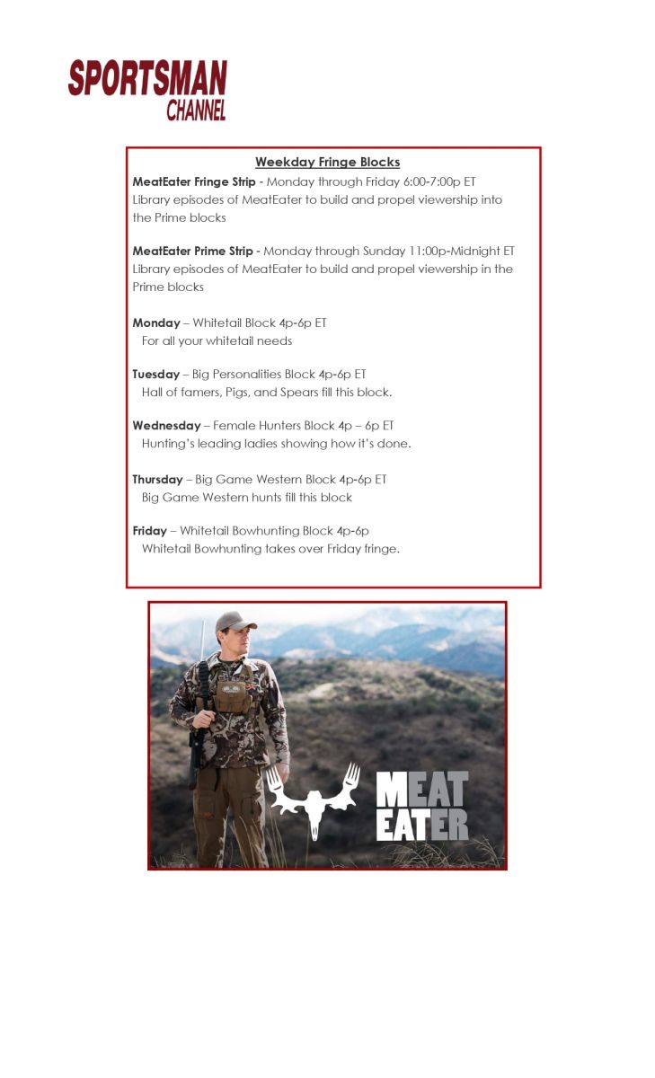 Whether launching a national campaign or expanding an existing one, Sportsman Channel offers a focused and trusted environment for reaching outdoor consumers.